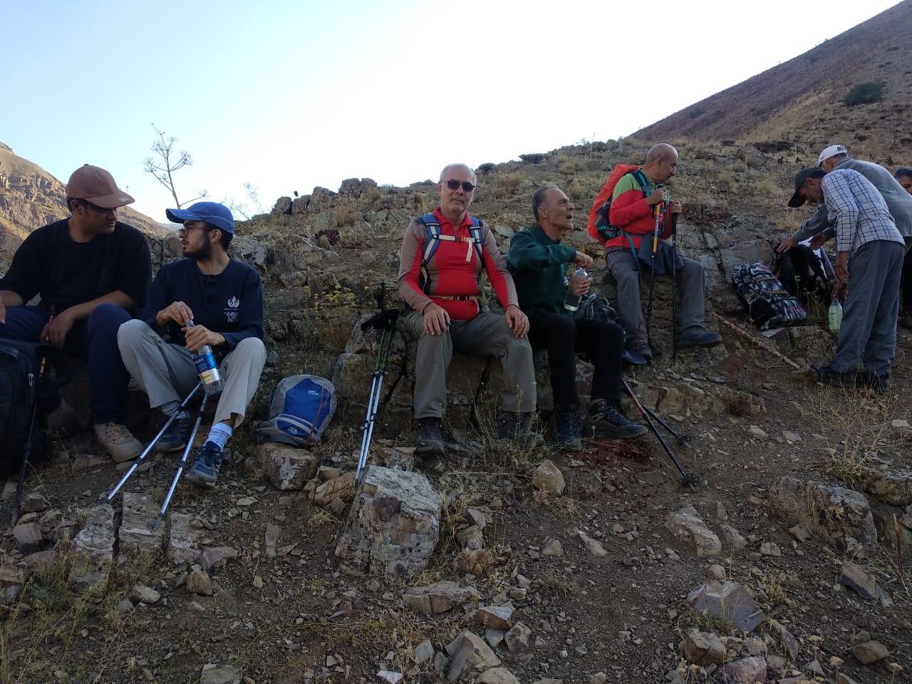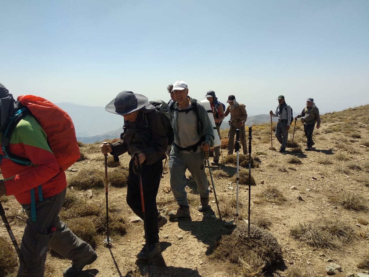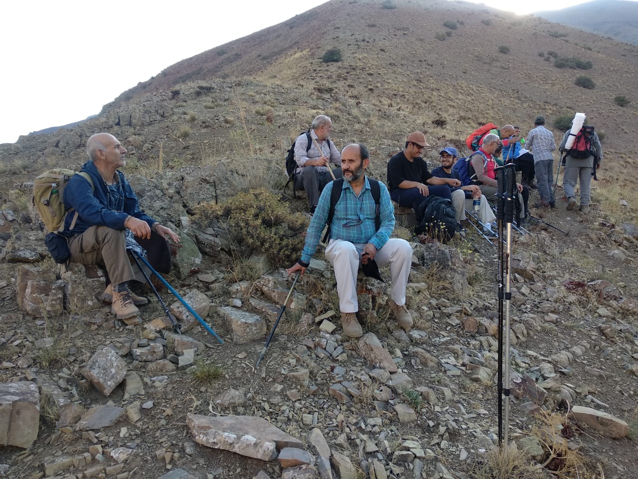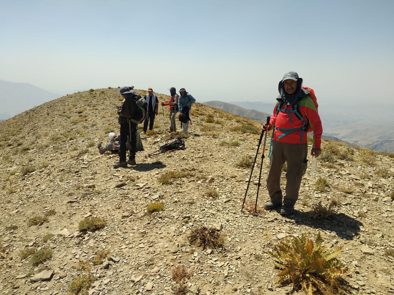![]() علت این نامگذای به درستی معلوم نیست و شاید به معنی سفره کهار باشد زیرا کوه های ناز و کهار در شمال آن قرار دارند. آغاز مسیر به سمت شمال و در مسیر جاده خاکی درجه ۳ و ماشین رو در کنار رودخانه است، ویلا ها و خانه های باغی بطور پراکنده دیده میشوند و پوشش گیاهی در حدود ۸۰ درصد درختان گردو و بقیه درخت بید ( برخی تنومند ) و آلبالو و ... است و بنظر میرسد که در شهرستان کرج این روستا بیشترین تعداد درخت گردو را دارد. پس از یکساعت راه پیمایی از جاده و دره بیرون رفتیم و پس از گذشتن از رودخانه وارد یال اصلی منتهی به قله در سمت راست و در جهت شرق شدیم، قبلا در اینجا پل چوبی وجود داشت که سیل آنرا برده، اوایل مسیر شیب تندی دارد، از آنجا مشاهده کردیم که دره با همان وضعیت ادامه دارد و درختان صنوبر هم دیده میشدند، در کف دره های دیگر در سمت جنوب درختان بید به مقدار زیاد روییده اند که نمایانگر وجود آب است. ساعت ۹ به استراحت و خوردن صبحانه پرداختیم و پس از نیم ساعت براه افتادیم، پس از طی مسافتی تعداد ۳ نفر از همنوردان از ادامه صعود بازمانده و برگشتند. هوا صاف و آفتابی و قدری غبار آلود بود و گاهی باد ملایمی میوزید که باعث میشد گرما آزارمان ندهد. ساعت یک و ۱۵ دقیقه به تعداد ۱۰ نفر به قله به بلندی ۳۳۵۰ متر رسیدیم و پس از خواندن سرود ای ایران به استراحت پرداختیم.