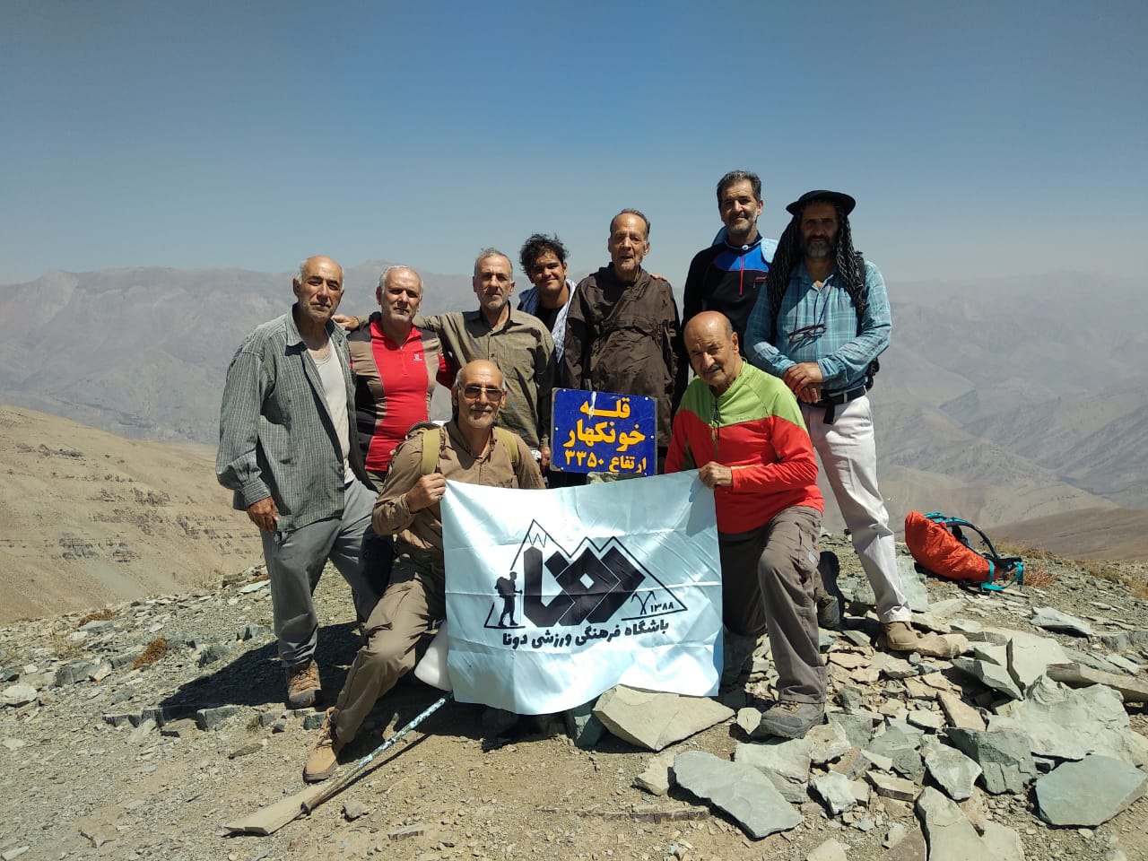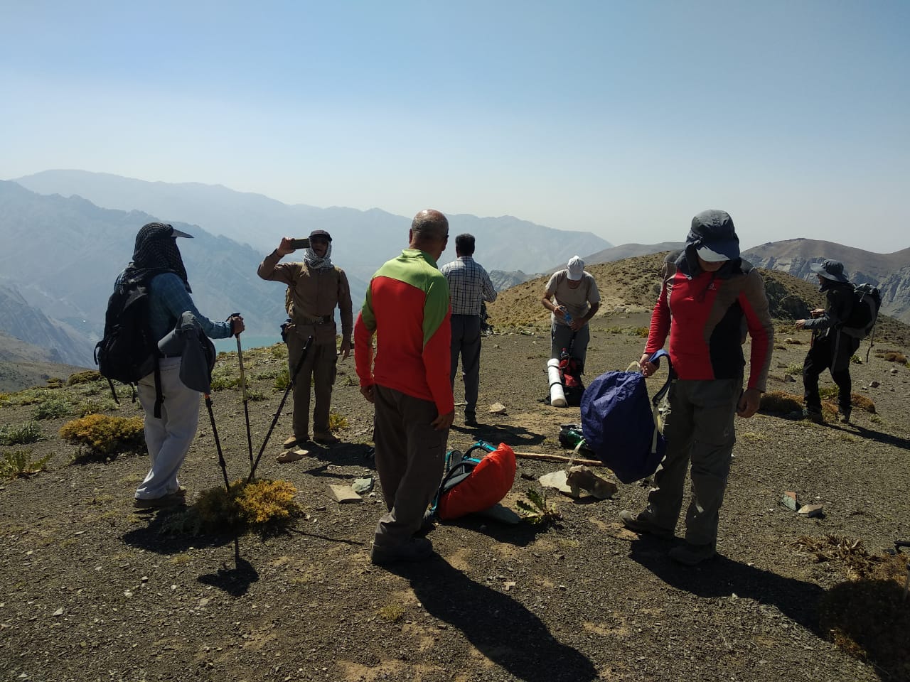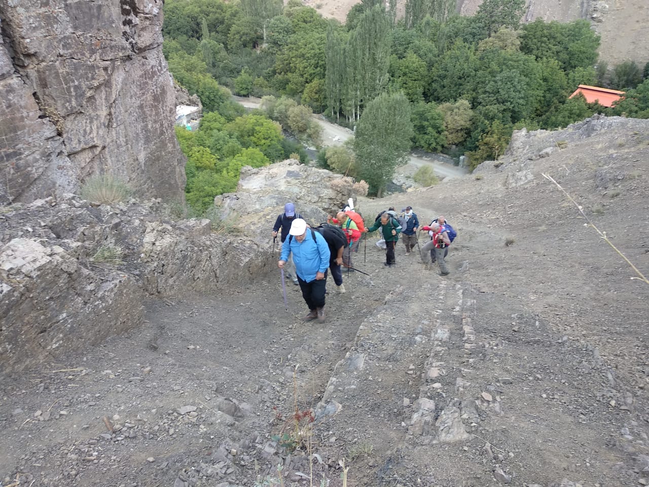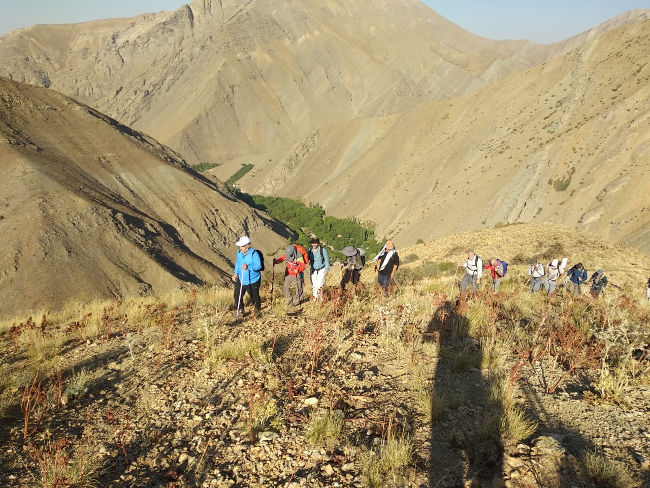 ![]() علت این نامگذای به درستی معلوم نیست و شاید به معنی سفره کهار باشد زیرا کوه های ناز و کهار در شمال آن قرار دارند. آغاز مسیر به سمت شمال و در مسیر جاده خاکی درجه ۳ و ماشین رو در کنار رودخانه است، ویلا ها و خانه های باغی بطور پراکنده دیده میشوند و پوشش گیاهی در حدود ۸۰ درصد درختان گردو و بقیه درخت بید ( برخی تنومند ) و آلبالو و ... است و بنظر میرسد که در شهرستان کرج این روستا بیشترین تعداد درخت گردو را دارد. پس از یکساعت راه پیمایی از جاده و دره بیرون رفتیم و پس از گذشتن از رودخانه وارد یال اصلی منتهی به قله در سمت راست و در جهت شرق شدیم، قبلا در اینجا پل چوبی وجود داشت که سیل آنرا برده، اوایل مسیر شیب تندی دارد، از آنجا مشاهده کردیم که دره با همان وضعیت ادامه دارد و درختان صنوبر هم دیده میشدند، در کف دره های دیگر در سمت جنوب درختان بید به مقدار زیاد روییده اند که نمایانگر وجود آب است. ساعت ۹ به استراحت و خوردن صبحانه پرداختیم و پس از نیم ساعت براه افتادیم، پس از طی مسافتی تعداد ۳ نفر از همنوردان از ادامه صعود بازمانده و برگشتند. هوا صاف و آفتابی و قدری غبار آلود بود و گاهی باد ملایمی میوزید که باعث میشد گرما آزارمان ندهد. ساعت یک و ۱۵ دقیقه به تعداد ۱۰ نفر به قله به بلندی ۳۳۵۰ متر رسیدیم و پس از خواندن سرود ای ایران به استراحت پرداختیم.