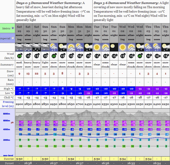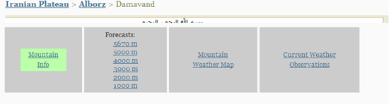 توجه کنید برای انتخاب کوههایی که گفتم باید در قسمت subrange رشته کوه رو اول انتخاب کنید تا کوههای مربوط به رشته کوه در قسمت mountain ظاهر شود. به عنوان مثال برای انتخاب کرکس باید Central Iranian Plateau رو انتخاب کنید و برای انتخاب دنا باید گزیته subrange را روی انتخاب اول که خالی است قرار دهید. تعدادی از کوهها هم در قسمت range باید به جای iranian Plateau ، گزینه zagros را انتخاب کنید تا بتوانید کوههایی مثل تفتان یا زردکوه را انتخاب کنید. کمی دسته بندی بهم ریخته و نادرست است اما اطلاعات خود کوهها درسته و ممکنه هر چند وقت یکبار دسته بندی هاشون عوض بشه یا کوهها و محدوده های جدیدی به سایت اضافه بشه. بعد از اینکه کوه را انتخاب کردید ، صفحه به صورت خودکار عوض شده و اطلاعات هواشناسی کوه مربوطه نمایش داده می شود. و درابتدای صفحه چنین چیزی خواهیم دید : ![]() در صفحه اول اطلاعات محدوده جغرافیایی کوه مورد نظر رو میبینید و خبری از پیش بینی آب و هوای اون نیست اما به بالای صفحه که عکسش رو براتون گذاشتم نگاه کنید. در ستون Forecast از 1000 متری تا ارتفاع قله یعنی 5670 متری برای شما دسته بندی کرده و با کلیک بر روی هر کدوم از اونها ، پیش بینی آب و هوای کوه رو در اتفاع مورد نظر می بینید. مثلا ما بر روی 4000 متر کلیک می کنیم یعنی حدود جایی که بارگاه سوم و یا پناهگاه سیمرغ قرار دارد و چنین چیزی خواهیم داشت : در اینجا پیش بینی هوا شناسی امروز و 5 روز آینده رو به ما نشون می ده و اطلاعات هر روز رو در سه قسمت صبح ، بعد از ظهر و شب به تفکیک نمایش داده . اگر اطلاعات هواشناسی رو برای اولین وضعیت یعنی صبح همین امروز بیان کنیم به ما میگه که در صبح روز شنبه ما: