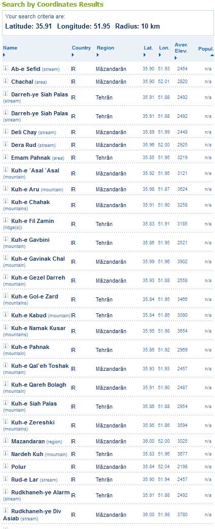 من به دلیل اینکه برخی از دوستان از ایستگاه پاراگلایدر وکایت سواری شمال جنت آباد استفاده می کنند اطلاعات یک زمان خاصی از روز چهارم بهمن ماه 1392 رو استخراج کردم وگذاشتم اینجا. مختصات نقطه ای رو که من وارد کردم ، دقیقا مختصات وسط میدان فرود در ایستگاه می باشد. که البته از روی GPS خودم گرفتم(و نه از سایت گوگل ارث). البته در شعاع دو کیلومتری ذیل نتیجه ای نگرفتم. اما در شعاع 5 کیلومتری حدود 3 صفه اطلاعات نقاط پیرامونی رو به من داد که بعیده به راحتی بشود از جای دیگری حتی منابع داخلی به اینصورت دسته بندی شده تهیه کرد ![]() ![]() ![]() می بینید که هنوز این یک صفحه از سه صفحه لیسته
