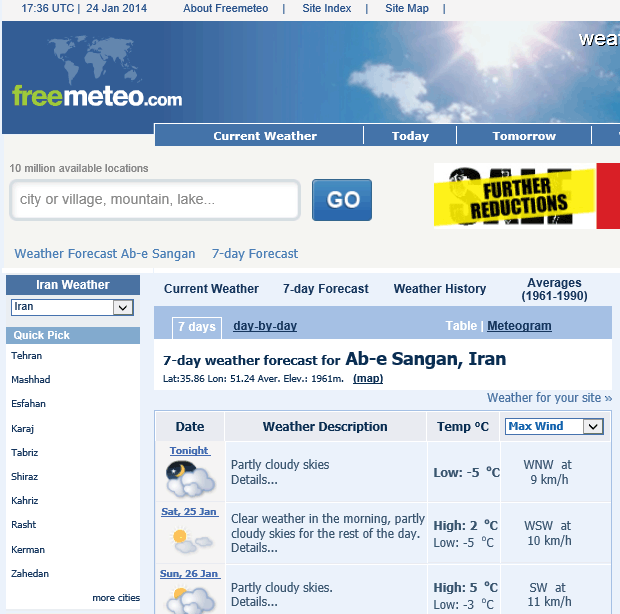 ![]() : اگر به زمان گرفتن این اطلاعات دقت کنید نشون میده که من اطلاعات مربوط به ساعت 17.36 روز 24 ژانویه 2014 البته به ساعت جهانی رو گرفتم و پیش بینی وضع هوای 7 روز آینده است ![]() ![]() سایر اطلاعاتی که من نمی آورم و باید شما گزینه های دیگر رو لمس کنید و تحقیقش با خودتون عبارتند از تاریخچه اطلاعات هواشناسی از سال ۱۹۶۰ میلادی تا کنون (چی شد کف کردید؟؟؟؟؟)